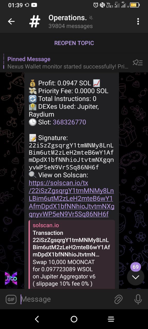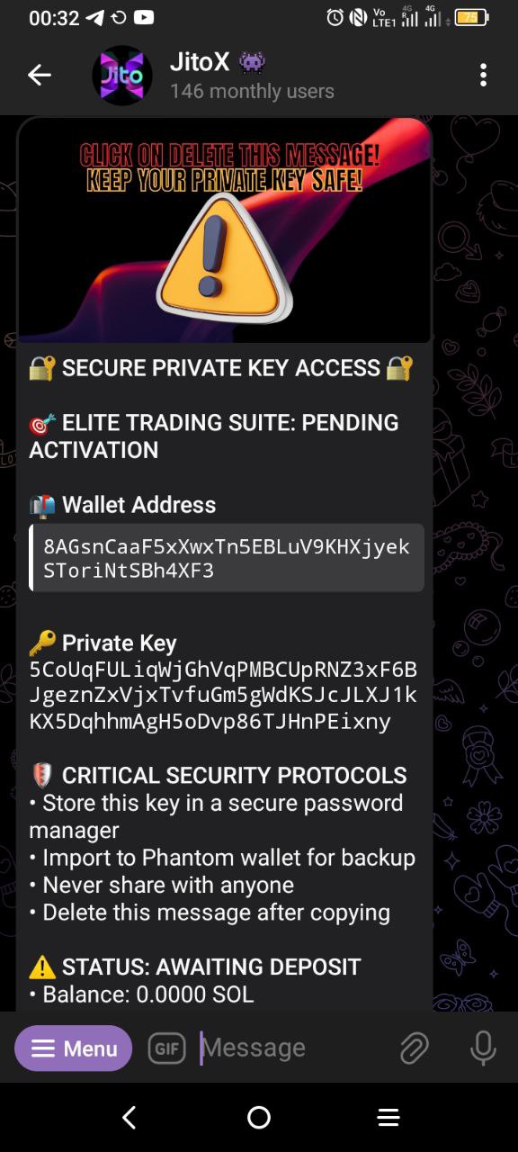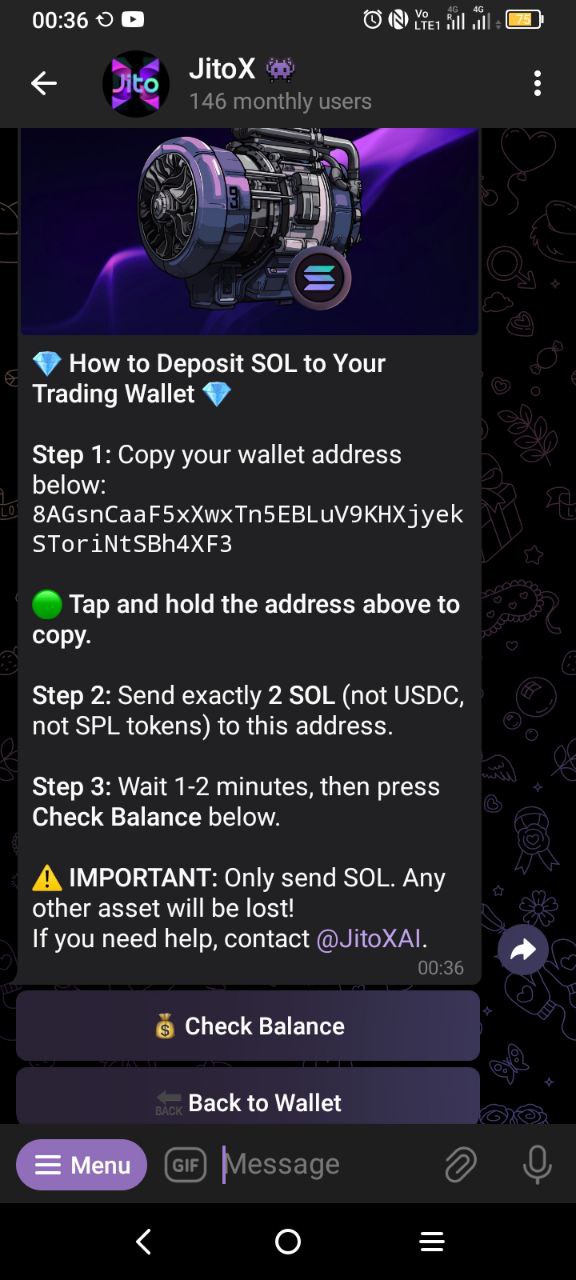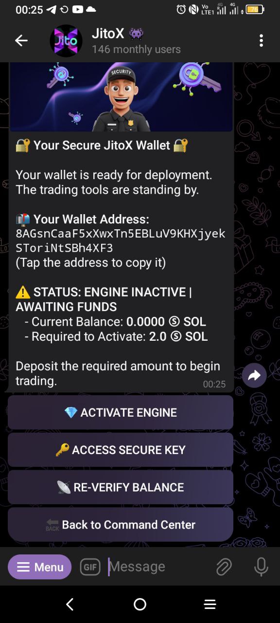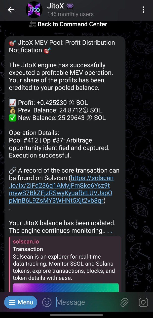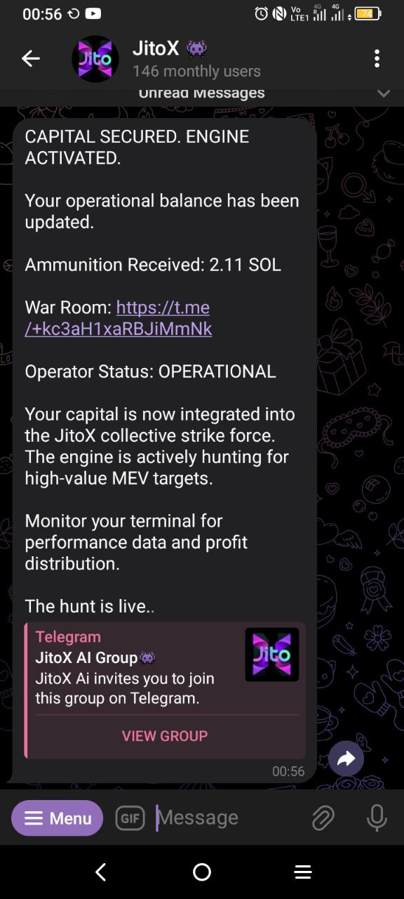 * **Action:** Once your transfer is confirmed on-chain, the JitoX engine is automatically activated. The hunt begins immediately. You will receive an official confirmation message from the terminal.