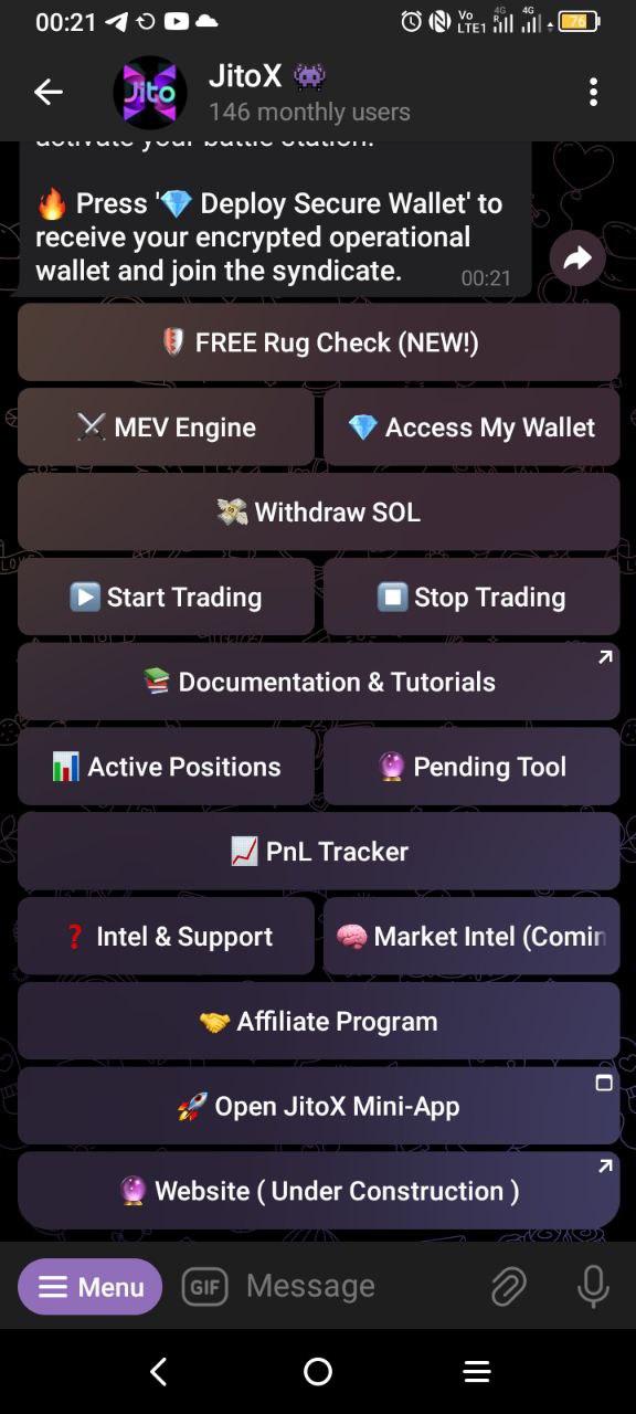 * **Action:** Open your direct comms with the JitoX bot on Telegram and execute the /start command. You will be presented with the main command center.